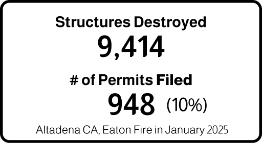 Rebuilding times are long - very long. Some communities never recover. Recent data suggests that some communities have achieved 25% rebuild after two years and 58% after 4-6 years. Altadena CA, now 9 months post Eaton fire, has barely gotten started. Accessing financial resources and knowing the amount available to rebuild are critical variables for recovery to begin.